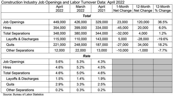The construction industry registered 449,000 job openings in April, according to an Associated Builders and Contractors analysis of data from the U.S. Bureau of Labor Statistics’ Job Opening and Labor Turnover Survey. The JOLTS survey defines a job opening as any unfilled position for which an employer is actively recruiting. Industry job openings increased by 23,000 last month and are up 120,000 from the same time last year.