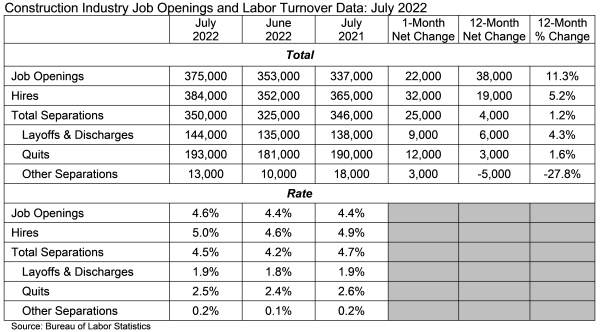 The construction industry had 375,000 job openings in July, according to an Associated Builders and Contractors analysis of data from the U.S. Bureau of Labor Statistics’ Job Openings and Labor Turnover Survey. JOLTS defines a job opening as any unfilled position for which an employer is actively recruiting. Industry job openings increased by 22,000 last month and are up 38,000 from the same time last year.