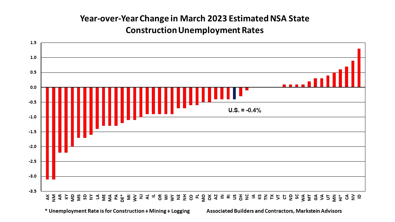 In March 2023, 43 states had lower estimated construction unemployment rates than in February, four states had higher rates and three (Minnesota, Montana and Utah) had the same rate.