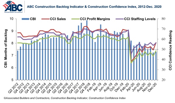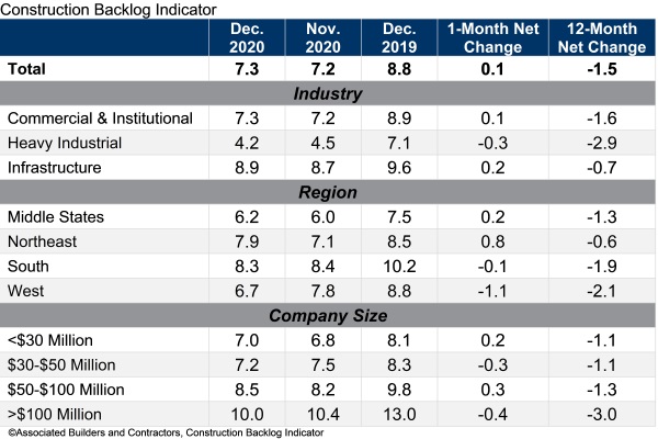 Associated Builders and Contractors reported today that its Construction Backlog Indicator rebounded modestly to 7.3 months in December, an increase of 0.1 months from November’s reading, according to an ABC member survey conducted from Dec. 18 to Jan. 5. Backlog is 1.5 months lower than in December 2019.