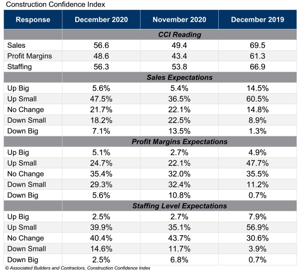 ABC’s Construction Confidence Index readings for sales, profit margins and staffing levels increased in December. The sales index climbed above the threshold of 50, indicating contractors expect to grow sales over the next six months. The index reading for profit margins remained below that threshold. The staffing level index increased to 56.3 but remains well below its December 2019 reading.