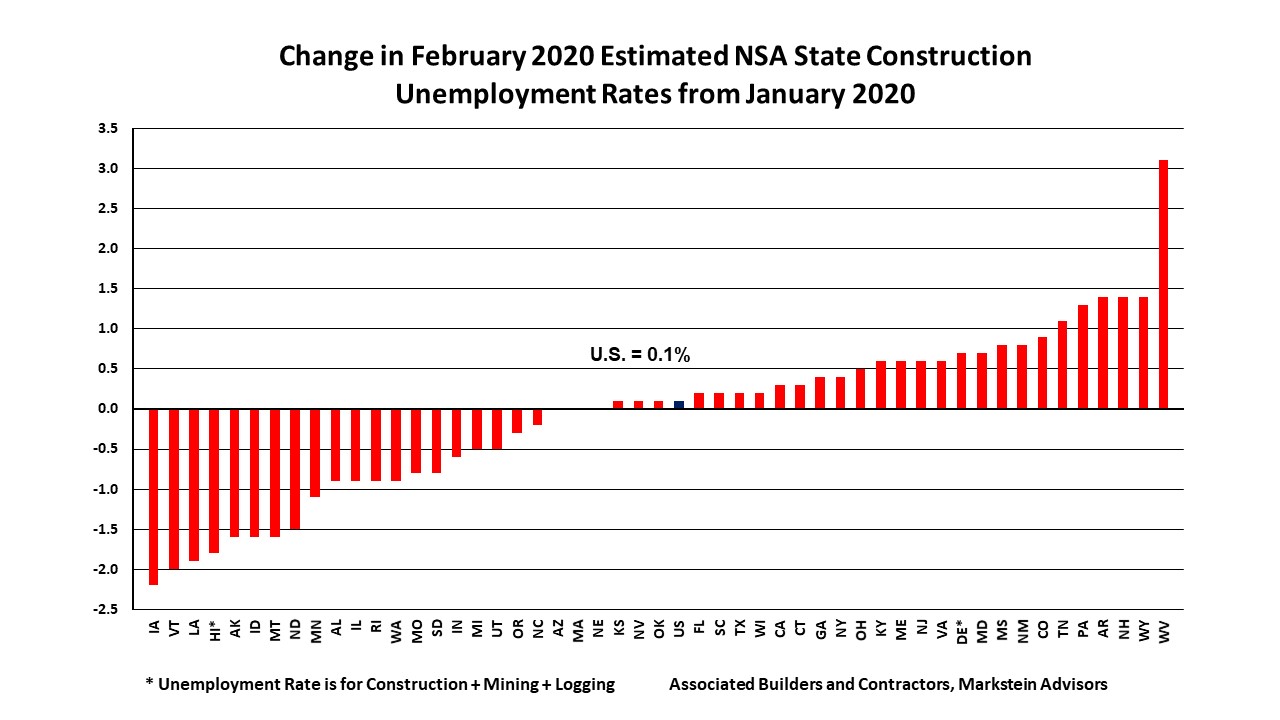 “In February, large portions of the country experienced above-average temperatures. The Eastern third of the country, along with the Northern tier of states and the West Coast, had warmer than normal weather. This aided construction activity and employment,” said Bernard M. Markstein, Ph.D., president and chief economist of Markstein Advisors, who conducted the analysis for ABC. “These numbers were collected before actions were taken by many localities and businesses to control the spread of COVID-19 in the United States. These efforts to limit the impact of the coronavirus on the health of the nation and consequently on construction activity will begin to show in the data for March and April and beyond.”