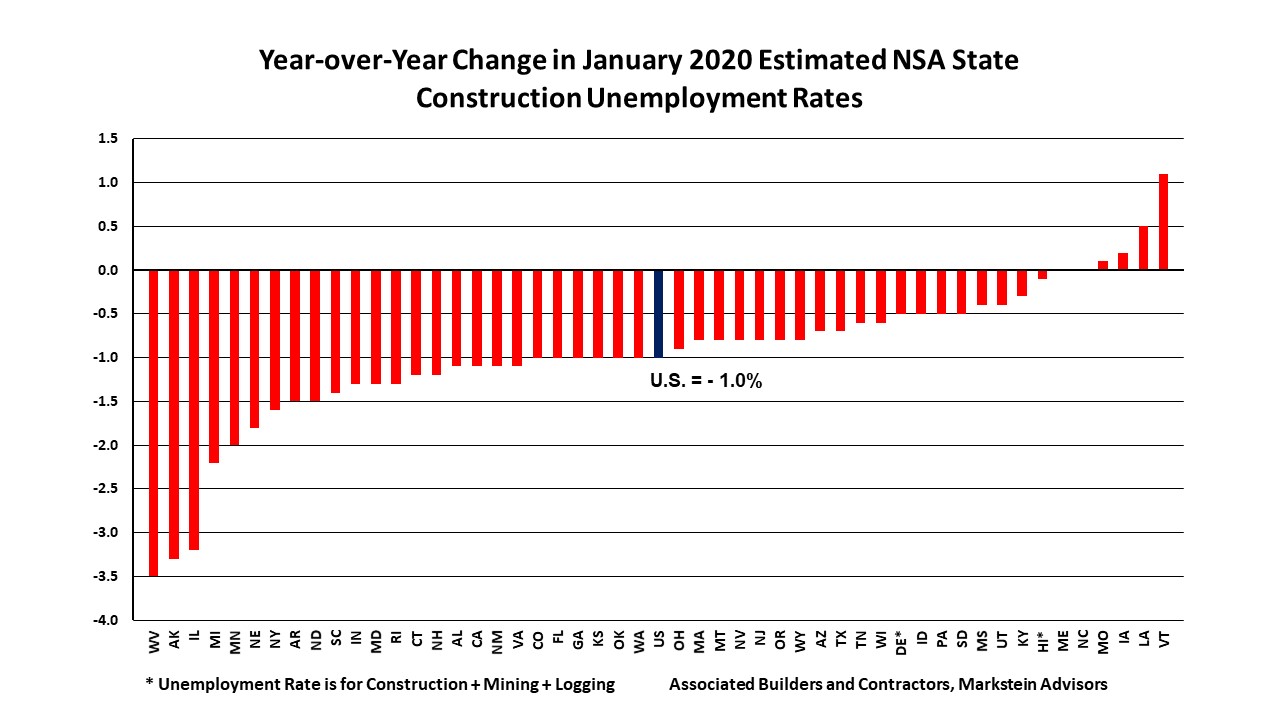 The national NSA construction unemployment rate increased 0.4% from December 2019 to January. Over the time since the data series began in 2000, the historical pattern always has been an increase in rates from December. Among the states, 41 had higher estimated construction unemployment rates than in December, while eight were lower and one was unchanged (New York). At the same time, the nation and 35 states posted their lowest January construction unemployment rate on record.