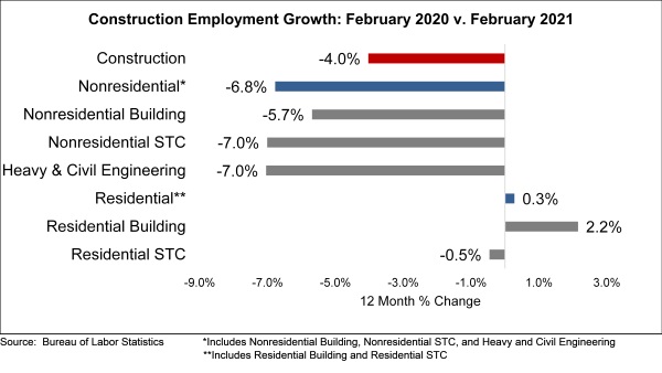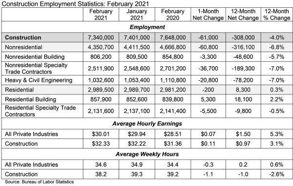 The construction industry lost 61,000 jobs on net in February, according to an Associated Builders and Contractors analysis of data released today by the U.S. Bureau of Labor Statistics. During the last ten months, the industry has added 805,000 jobs, recovering 72.3% of the jobs lost during the earlier stages of the pandemic.