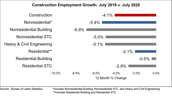 The construction unemployment rate was 8.9% in July, up 5.1 percentage points from the same time last year. Unemployment across all industries declined from 11.1% in June to 10.2% this month.