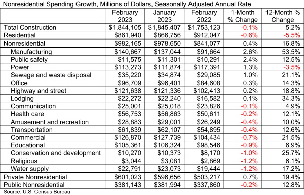 Spending declined on a monthly basis in 9 of the 16 nonresidential subcategories. Private nonresidential spending was up 0.7%, while public nonresidential construction spending was down 0.2% in February.