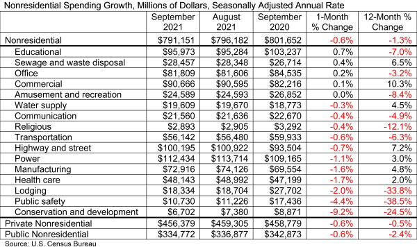 Spending was down in 11 of the 16 nonresidential subcategories, with spending in amusement and recreation unchanged for the month. Both private and public nonresidential spending declined 0.6% in September.