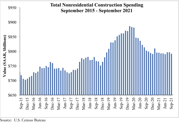 National nonresidential construction spending contracted 0.6% in September, according to an Associated Builders and Contractors analysis of data published today by the U.S. Census Bureau. On a seasonally adjusted annualized basis, nonresidential spending totaled $791.2 billion for the month.