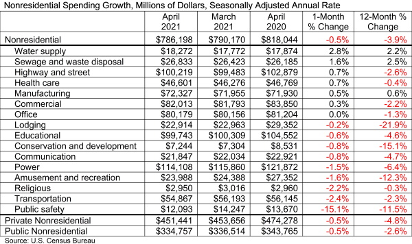 Spending was down on a monthly basis in nine of 16 nonresidential subcategories. Both private and public nonresidential construction spending were down 0.5% for the month.