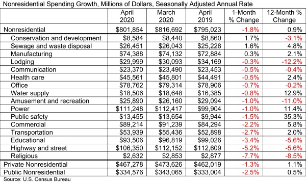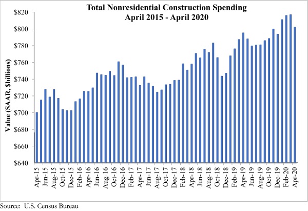 National nonresidential construction spending decreased by 1.8% in April, according to an Associated Builders and Contractors analysis of data published today by the U.S. Census Bureau. On a seasonally adjusted annualized basis, spending totaled $801.8 billion for the month, a 0.9% increase from April 2019.