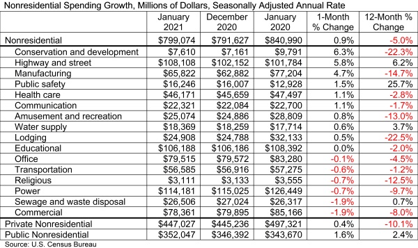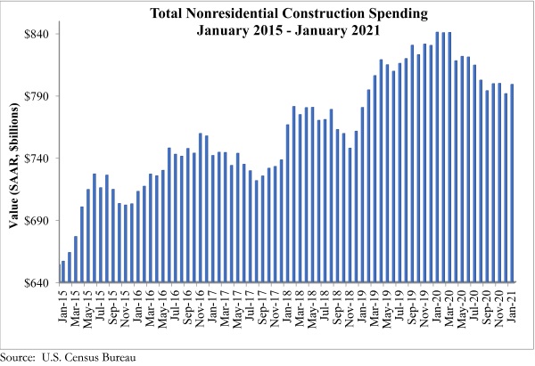 National nonresidential construction spending increased 0.9% on a monthly basis in January 2021 but is down 5% since January 2020, according to an Associated Builders and Contractors analysis of data published today by the U.S. Census Bureau. On a seasonally adjusted annualized basis, nonresidential spending totaled $799.1 billion for the month.