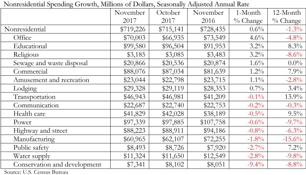 Nonresidential construction spending expanded 0.6 percent in November, totaling $719.2 billion on a seasonally adjusted basis, according to an Associated Builders and Contractors (ABC) analysis of data released today by the U.S. Census Bureau. Despite the month-over-month expansion, nonresidential spending fell 1.3 percent from November 2016.