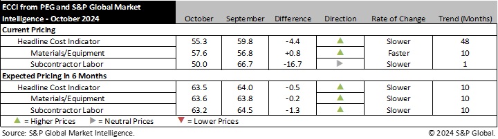 Engineering and construction costs increased in October, according to the Engineering and Construction Cost Indicator from PEG and S&P Global Market Intelligence. The headline Engineering and Construction Cost Indicator, a leading indicator measuring wage and material inflation for the engineering, procurement and construction sector declined 4.4 points to 55.3 in October. The sub-indicator for materials and equipment costs edged up 0.8 points to 57.6 while the sub-indicator for subcontractor labor costs fell to 50 in October from 66.7 in September.