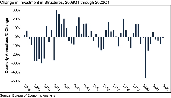 The U.S. economy contracted at a 1.4% annualized rate during the first quarter of 2022. Investment in nonresidential structures declined at an annual rate of 0.9% during the quarter and has contracted nine of the past 10 quarters, according to an Associated Builders and Contractors analysis of data released today by the U.S. Bureau of Economic Analysis.