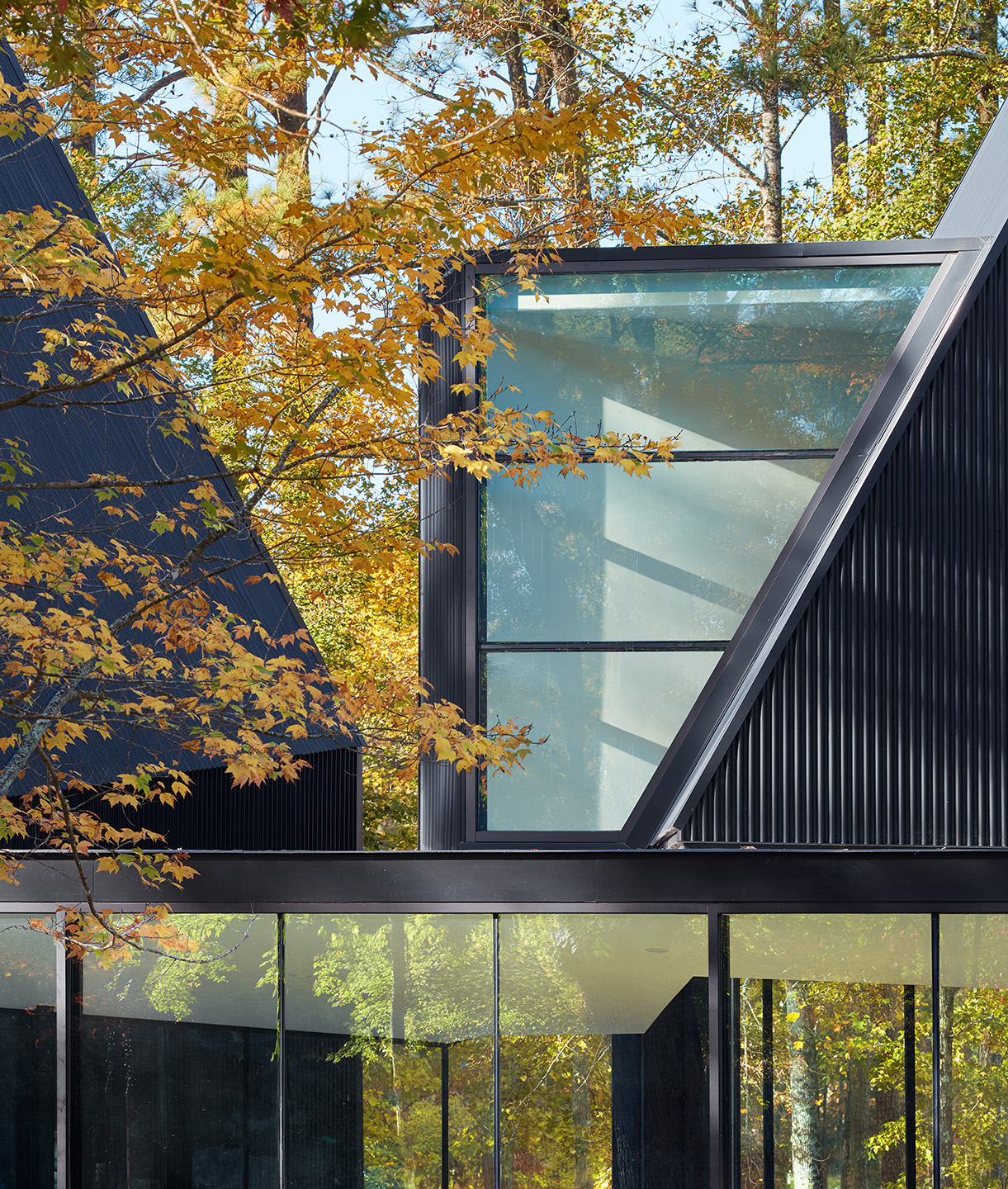 Tucked into a 26-ha (65-acre) wooded site in Hillsborough, N.C., the 260-m2 (2,800-sf) Steeplechase House embraces the landscape rather than reshaping it. Designed by Brooks + Scarpa and built by Tonic Design & Construction, the project preserves more than 98 percent of the original terrain—an intentional design strategy to emphasize ecological harmony. With this light touch, the home’s ribbed single-skin metal panels serve both as a durable envelope and a defining architectural gesture.