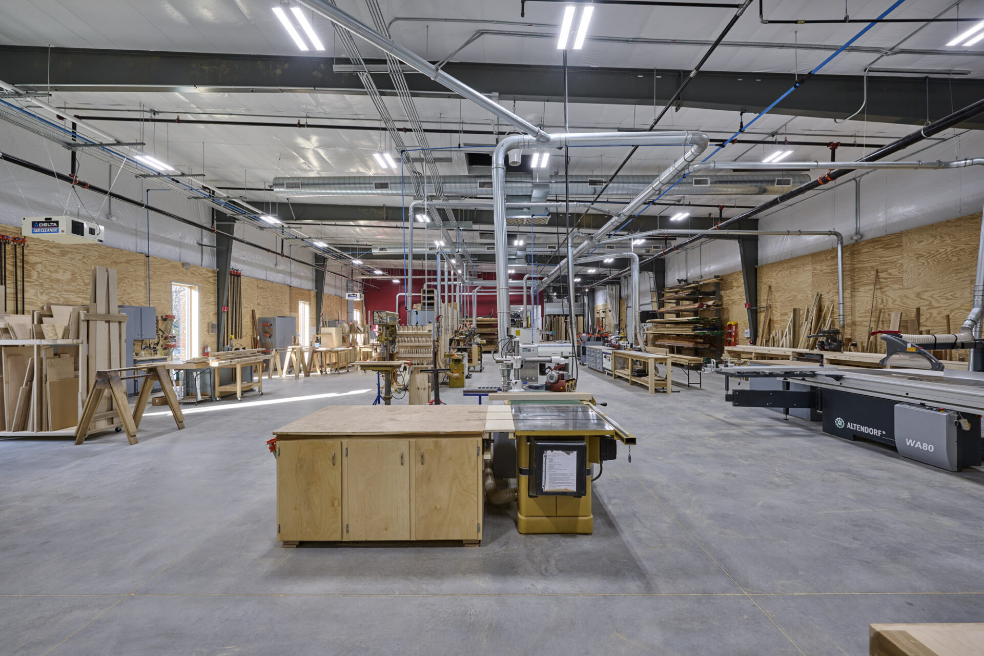 The structure reads like a haiku in steel. Line one is the primary grid—a simple, cost-effective PEMB shell from Chief Buildings that establishes a clean, column-free interior for fabrication and assembly. Line two is the entry sequence: a sculptural canopy of warm wood and standing seam metal that evokes the elegance of an organ case. Line three—both literally and figuratively—is the erecting room: a soaring volume pushing beyond the base grid to accommodate the height of assembled pipes, mirroring the scale of cathedral interiors.