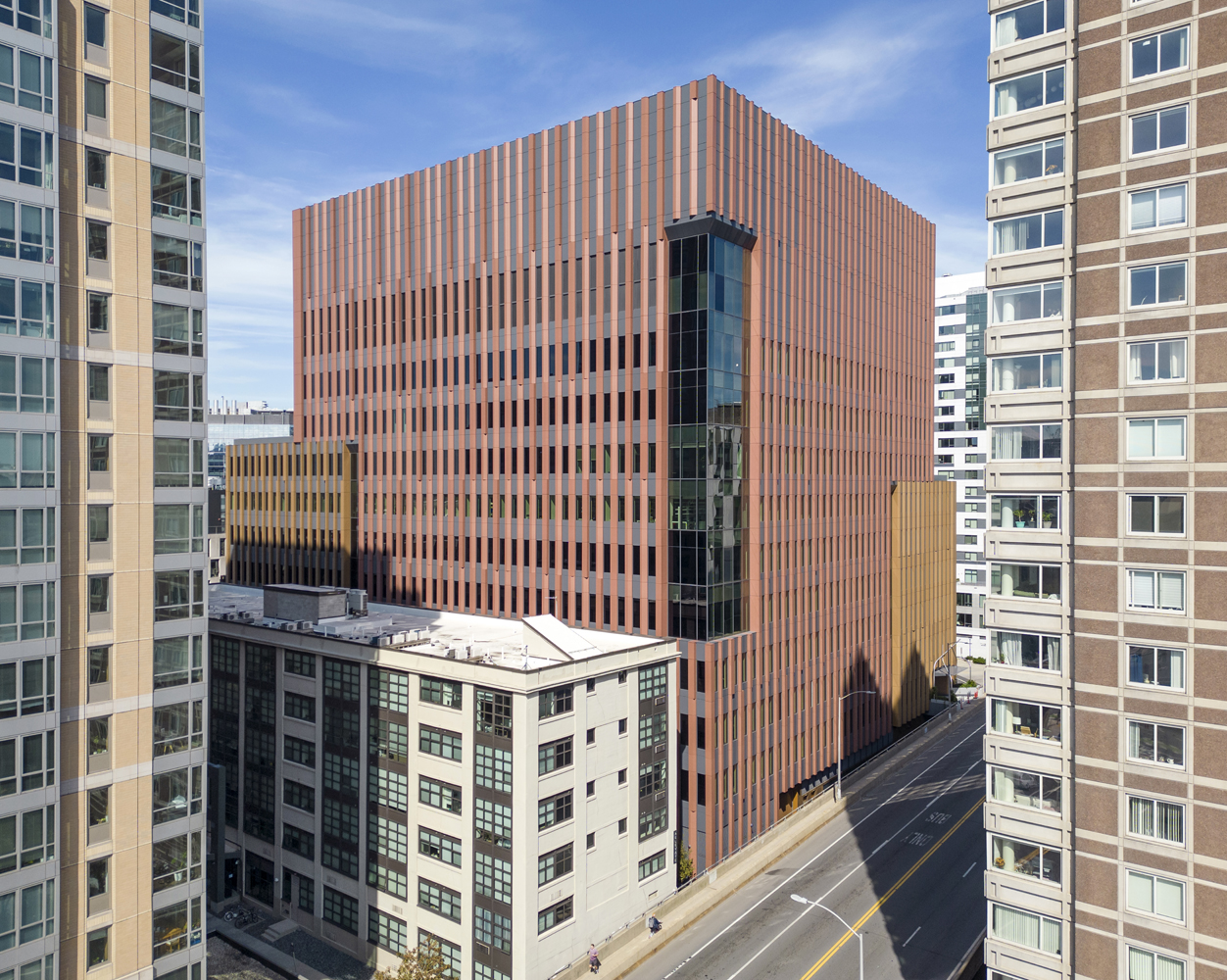 Metal was selected for its distinct advantages over heavier, more maintenance-intensive materials. The aluminum panels contain at least 20 percent post-consumer recycled content and are fully recyclable at the end of life. Their durable finishes are volatile organic compound (VOC)- free and resistant to UV exposure, ensuring that color and integrity remain intact in Boston’s variable climate. The lightweight nature of the panels also reduces structural load, simplifies installation, and cuts material waste on site—all contributing factors to Parcel U’s LEED Platinum certification.