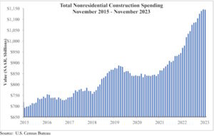 National nonresidential construction spending decreased 0.1 percent in November, according to an Associated Builders and Contractors (ABC) analysis of data published by the U.S. Census Bureau. On a seasonally adjusted annualized basis, nonresidential spending totaled $1.143 trillion.