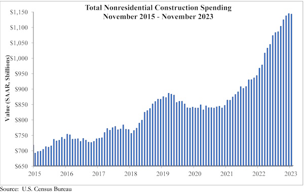 National nonresidential construction spending decreased 0.1 percent in November, according to an Associated Builders and Contractors (ABC) analysis of data published by the U.S. Census Bureau. On a seasonally adjusted annualized basis, nonresidential spending totaled $1.143 trillion.