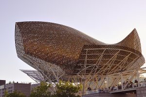 Bronze-colored steel defines another of Gehry’s designs, “El Peix.” This large sculpture in Barcelona, Spain, masterfully blends into its environment, depicting a fish that directly faces the Mediterranean Sea. Where architecture meets nature, this sculpture embraces its surroundings with sunlight moving through perforations in the steel and reflecting off its warm hue.