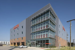 To draw the attention of passersby on Interstate 35W to a self storage facility in an industrial park, Robert W. Kelly Architect Inc. designed Public Storage in Fort Worth, Texas, with a combination of metal panels, masonry, and fenestration. Metal panels blend with brick cladding on the first floor, and windows placed throughout the four-story building.