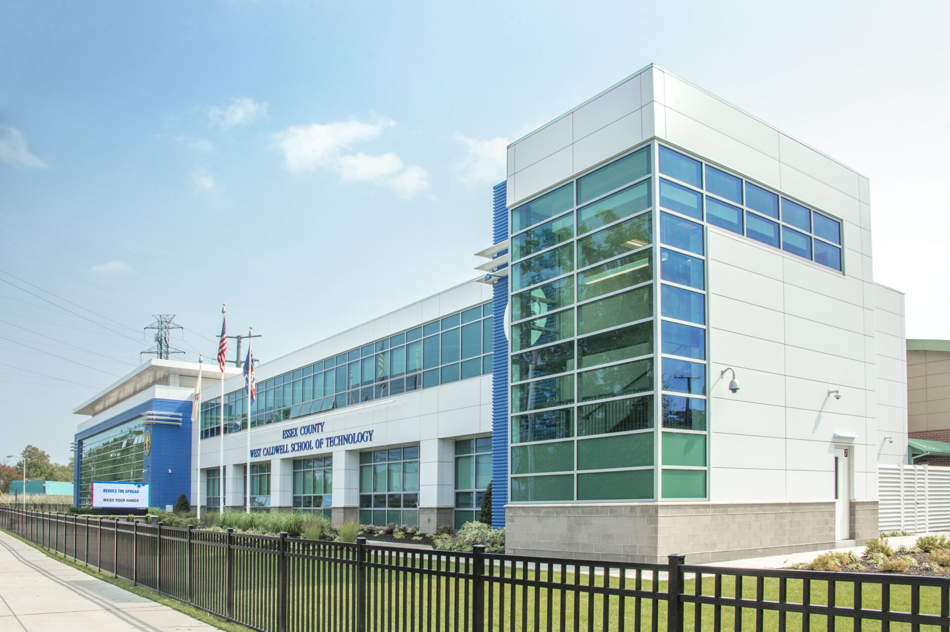 Di Cara | Rubino Architects designed a retrofit and renovation project for Essex County West Caldwell School of Technology in West Caldwell, N.J., that included a modern exterior. The scope of the project included a two-story addition to the front of the school, retrofit of the exterior with metal panels and other materials, outdoor courtyard, retrofitting interior spaces and renovating classrooms, laboratories and cafeteria. The existing building was formerly a factory converted into a school in 1976. A multipurpose gymnasium was added in 2002.