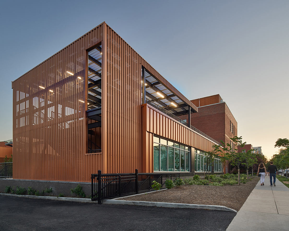 The project is a case study for adaptive reuse, integration of a new, modern addition and the preservation of a historic fieldhouse. The building has a teaching garden with an outdoor classroom on the roof. A canopy and stair tower wrapped with perforated metal provide shading.